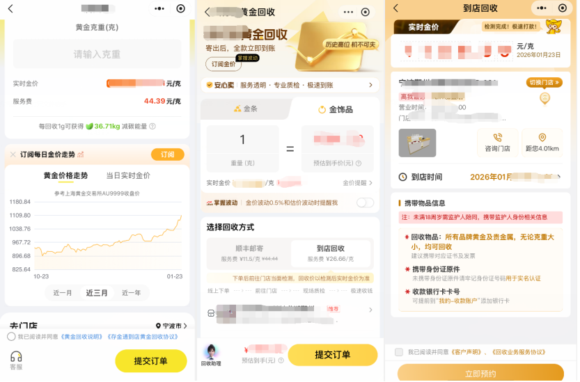 专门的黄金回收店家则主打高效变现,回收规则更为灵活,报价通常为实时大盘价减10元/克,不收取折旧费和手续费。